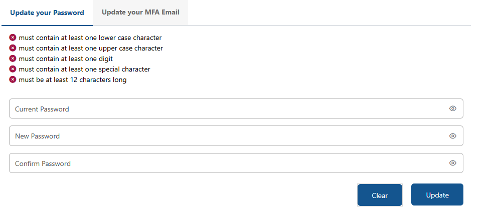 - Choose to Update your Password or Update your MFA Email