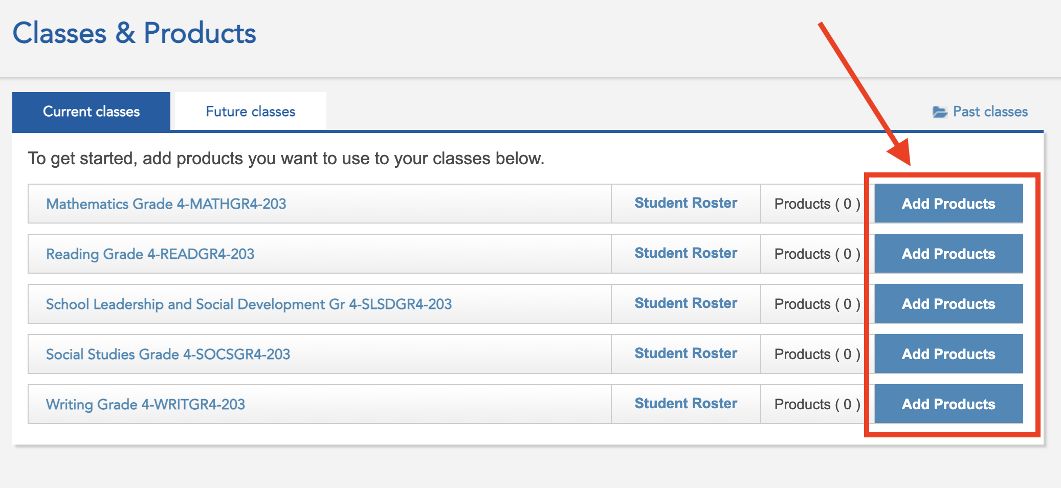 - You will see a screen that lists your classes. Under Current classes, click to Add Products next to the class that will be using Savvas. Repeat this step for each class that will be using a Savvas product.