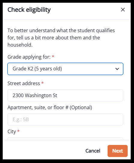 - Complete the pop-up form by filling out the grade you are looking for, your home address, and the language most spoken at home. Then click Next.