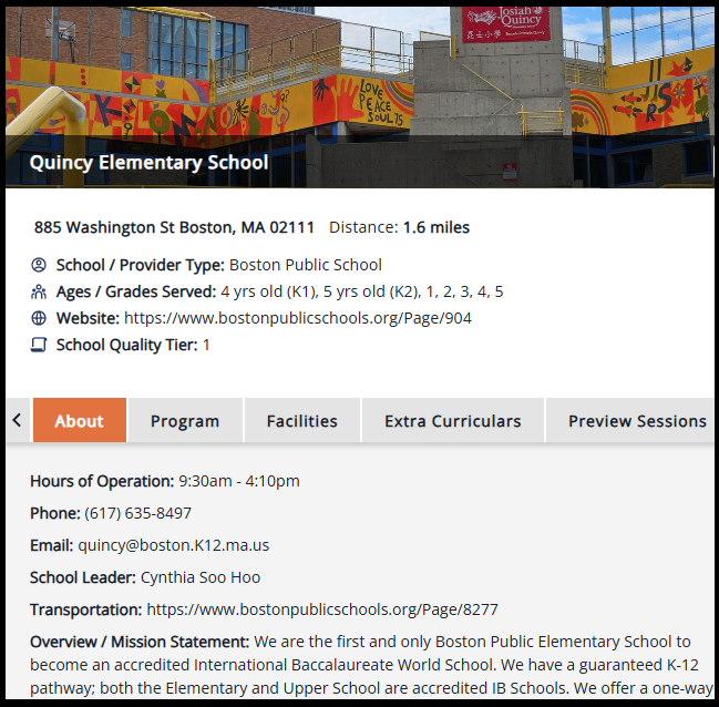 - Filter on Provider Type - Click on Boston Public School. The Great Starts site shows many different child care options in the City of Boston outside of BPS. Filtering on Boston Public School as the provider type will limit the results to just BPS options. This will impact both the pins on the map and the schools that appear in the list.