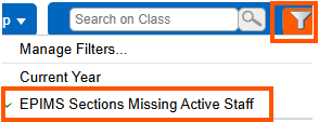 - Click on the Filter icon > EPIMS Sections Missing Active Staff. This filter yields all current year sections that are missing an active teacher.